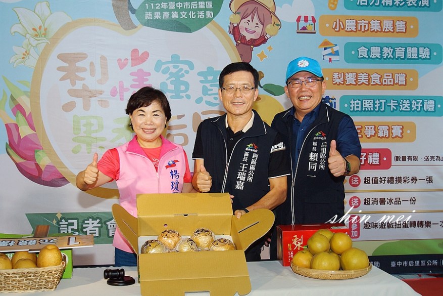 后里區長賴同一表示,后里區是好山好水也適宜種植的農業重區,出產的水梨更是汁多肉嫩、品質優良,主要品種有新興梨、豐水梨、秋水梨還有寶島甘露梨,由於夏天氣候炎熱使得水梨的糖度提高,邀請大家一同到后里品嚐最佳消暑聖品。