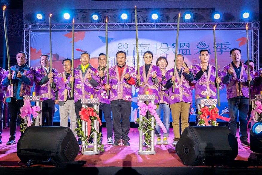 縣長許淑華出席晚會活動,與信義鄉長全志堅、縣議員全文才、第四河川副分署長張朝恭、南投民宿協會理事長彭成裕、縣府觀光處長陳志賢等人共同進行啟動儀式,歡迎大家到東埔泡好湯,體驗原民文化及特色。