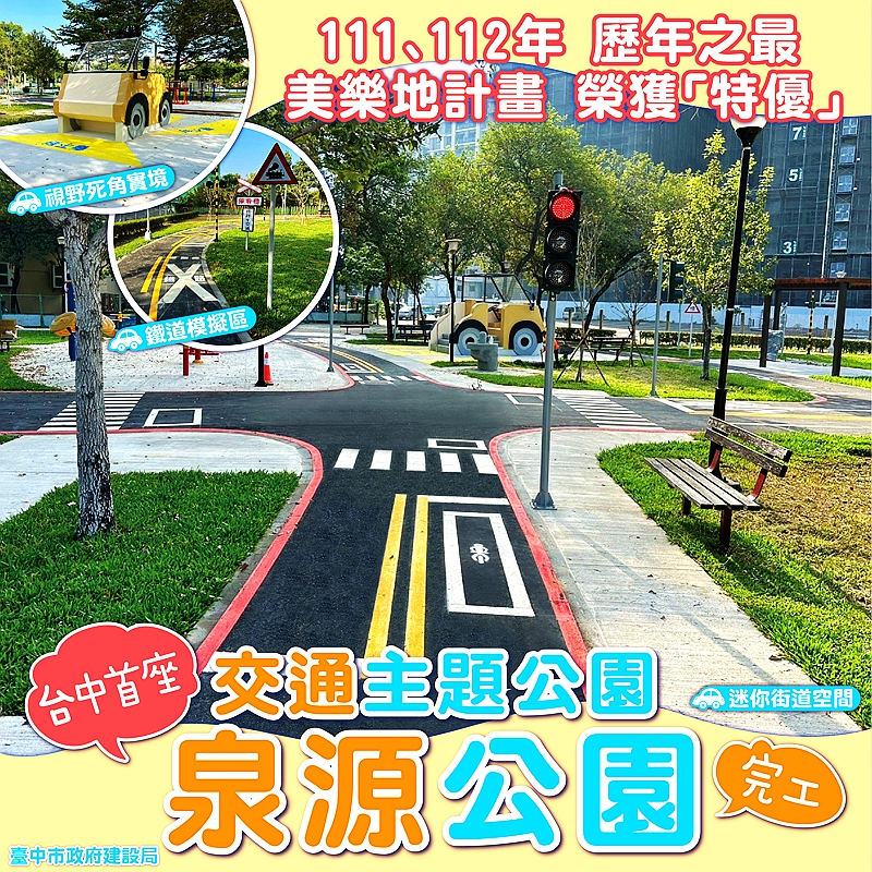 建設局陳局長表示,目前在太平馬卡龍公園以及南區、潭子區的綠空廊道都有設置滑步車場,而泉源兒童交通主題公園不但是特色公園,還是首座劃設標線及交通號誌的公園,小朋友可以騎自行車及滑步車(須戴頭盔使用)學習交通安全,日後如有合宜的公園場地也將會研議設置主題公園。