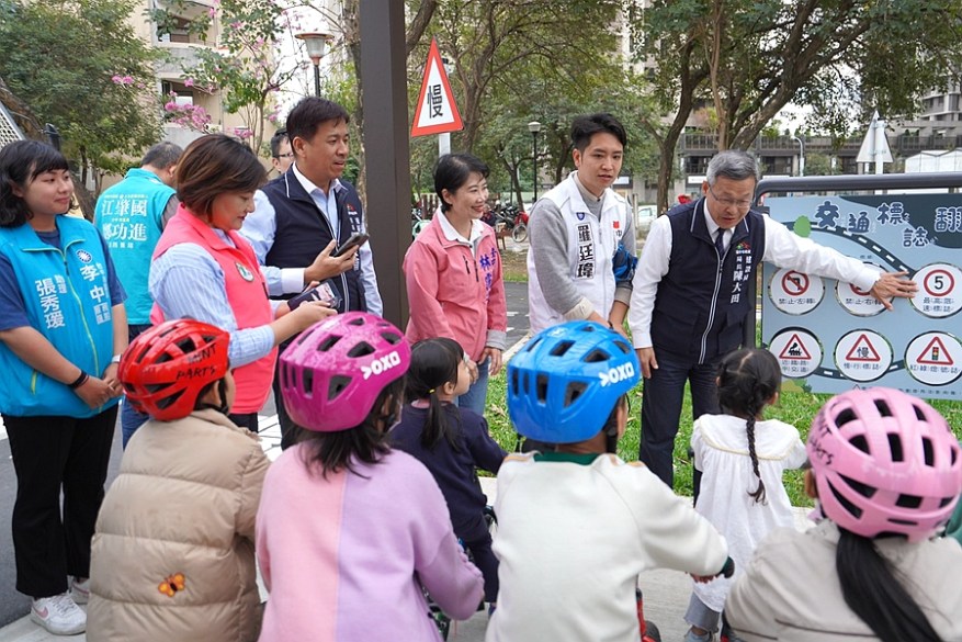 [新媒社 記者張銀澤/台中報導] 台中市長盧秀燕重視兒童教育及身心發展,持續推動美樂地計畫打造特色公園,市府建設局於東區泉源公園打造「首座兒童交通主題」公園,結合道路號誌、標誌、標線等設計,範圍面積計1,800平方公尺,工程總經費計420萬9,406元,打造出親子遊戲及學習交通安全的實作空間。昨(19)日由建設局長陳大田視察完工情形,現場吸引數十名家長帶小朋友使用自行車、滑步車一起學習交通知識,並實地模擬體驗。