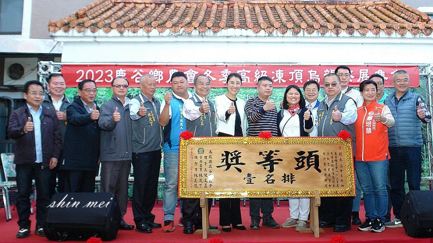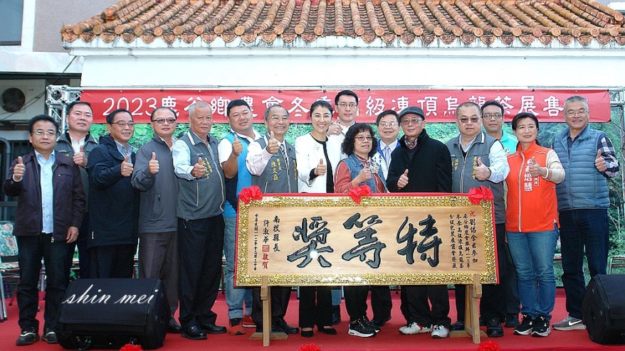 鹿谷鄉農會112年冬季高級凍頂烏龍茶分級包裝評審及展售會,由理事長陳文益主持,許縣長出席向得獎茶農致賀,並頒匾表揚特等獎得主劉倡余,以及入選頭等壹至頭等十等10位茶農。