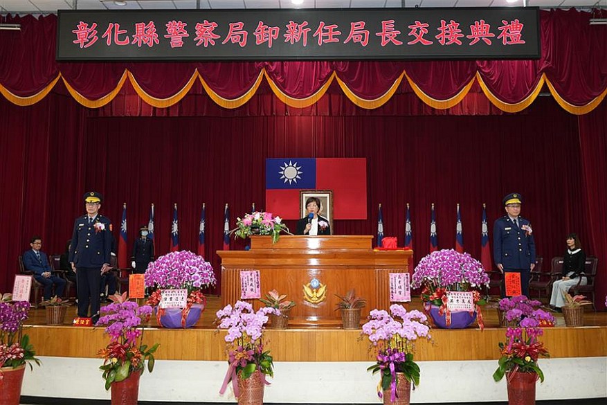 [新媒社 記者張銀澤/彰化報導] 彰化縣警察局局長張國雄榮陞內政部警政署警政委員,彰化縣治安重責由內政部警政署刑事警察局副局長陳明君接任,在今(17)日上午辦理交接典禮,並由縣長王惠美主持及警政署副署長李西河監交,現場貴賓雲集隆重。王縣長對張國雄局長任內卓越功績讚譽有加,並祝福高陞重要職務;也期許陳局長就任後能發揮所長,繼續推動精進各項治安工作。