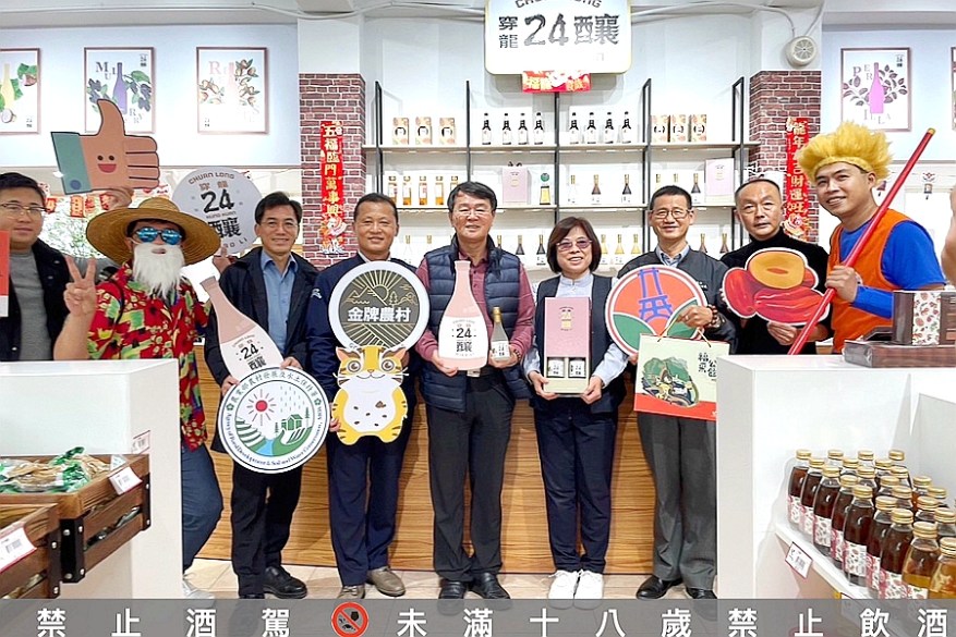 公館農會古雪雲總幹事表示,公館鄉農會是農業部輔導的農村酒莊,致力於開發具有在地特色的產品,其中「穿龍24釀」,榮獲2023年台灣百大伴手禮,也是農會連續第七年獲獎。陳榮俊分署長表示這款特色酒品結合在地的特色產業,強調在地食材釀造好酒,是分署推動地酒文化復興的代表酒品之一,在金龍迎春的歡慶季節,一同踏足公館,感受黃金小鎮的在地文化,並品味由公館農會開發的多元產品。
