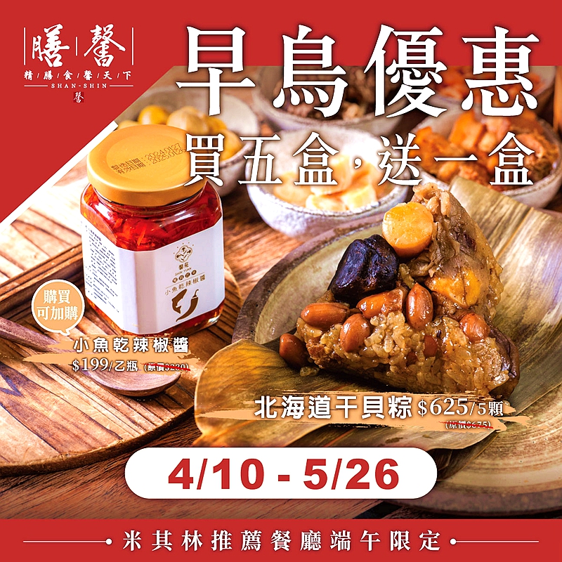 還有早鳥優惠,快點速速下訂北海道干貝粽 每盒 $625元/5顆去年好評不斷,今年再次龍粽登場!加入日本北海道干貝,粽子口感與風味更升級!