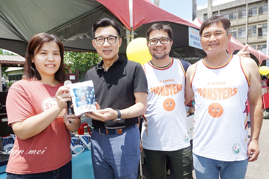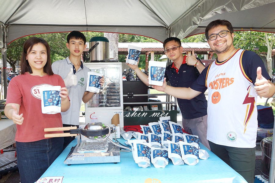 現場立法院江啟臣副院長與東勢「好樂農莊」加碼推出公益義賣活動,拍賣在地藍莓製作的愛心藍莓雞蛋仔,最後以一千元得標,除了能聞到香味四溢的藍莓香氣推廣在地藍莓產業外,也帶動公益回饋在地。