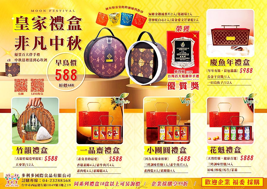 [新媒社 記者張銀澤/台中報導] 2024中秋佳節將近,又是一年一度送禮忙碌時節。俗諺有云,你是什麼角色,就會送出什麼貨色。如何送禮送到心坎哩,卻是一個不小的課題。別憂,別愁,如果你還沒拿定主意,不妨參考多利多國際食品有限公司的六款獨特禮盒,物超所值,大方高貴而不貴,絕對讓您別樹一幟,在送禮界傲笑江湖。