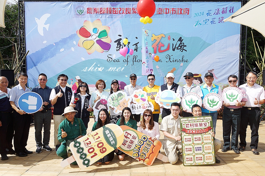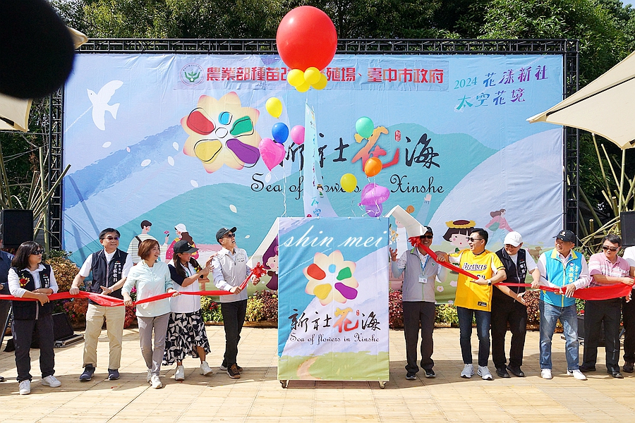 [新媒社 記者張銀澤/台中報導] 2024新社花海「花漾新社 太空花境」攜手臺中國際花毯節,於11月9日盛大開幕,至12月1日止,為期23天,歡迎民眾踴躍前往參觀。農業部於11月9日舉辦啟動儀式,由部長陳駿季、種苗改良繁殖場場長張定霖,偕同臺中市副市長鄭照新、立法院副院長江啟臣、立法委員何欣純、立法委員麥玉珍、新社農會總幹事羅文正,以及農業部、臺中市政府等貴賓蒞臨與會。