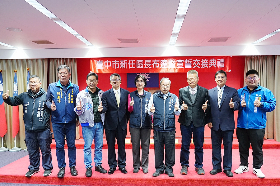 [新媒社 記者張銀澤/台中報導] 台中市政府今(16)日在台灣大道市政大樓惠中樓9樓市政廳舉行新任北屯、西屯及太平區長布達暨宣誓交接典禮,新任北屯區長由原北區區長陳宗祈調任、西屯區長由經發局公用事業科長鄭錫禧陞任、太平區長由農業局主秘陳柏宏調任。交接典禮由民政局長吳世瑋代表市長盧秀燕監誓,期勉3位新任區長任重道遠,不辜負眾人期望,在既有的良好基礎上,帶領公所同仁努力打拚,攜手共創市政繁景,提供市民更優質的服務。