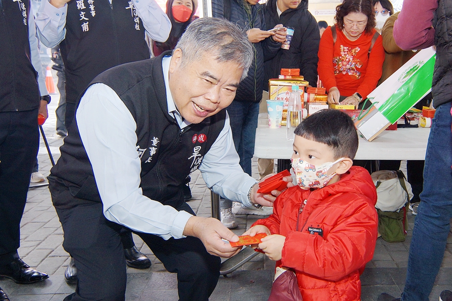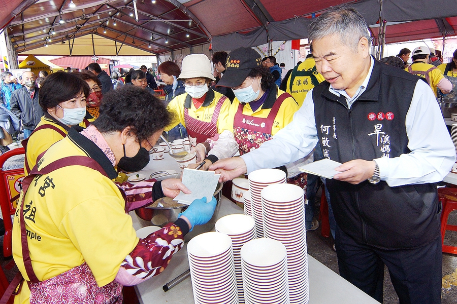 樂成宮董事長 何敏誠 新春祈求國泰民安、風調雨順,向民眾表達新春祝福,特別感謝樂成宮400多位志工,從大年初一到初五輪班,煮了一萬多斤的平安麵線,每個志工都腰酸背痛,何董事長很貼心的準備痠痛貼布,慰勞辛苦的志工,也祝福大家平安順利,大家過好年,蛇年行大運。