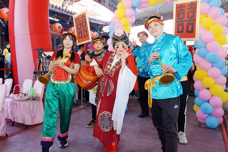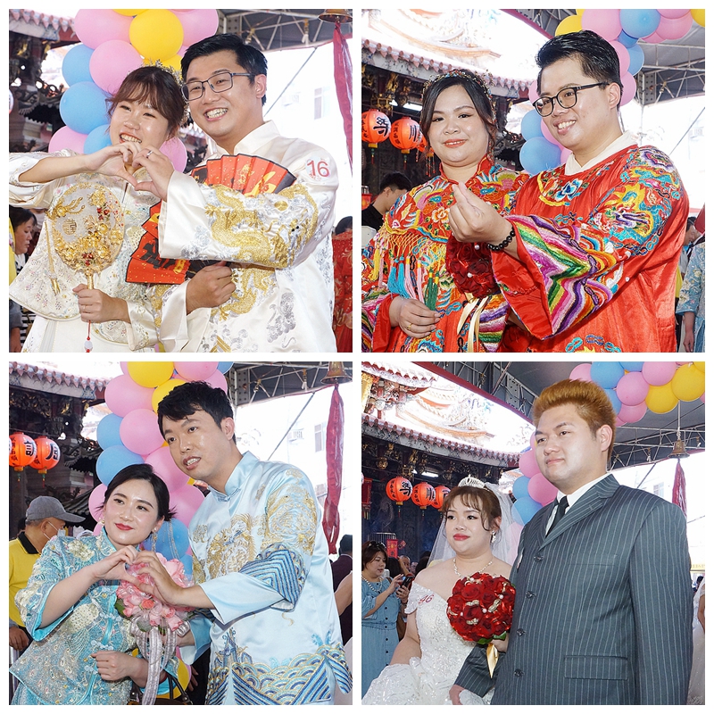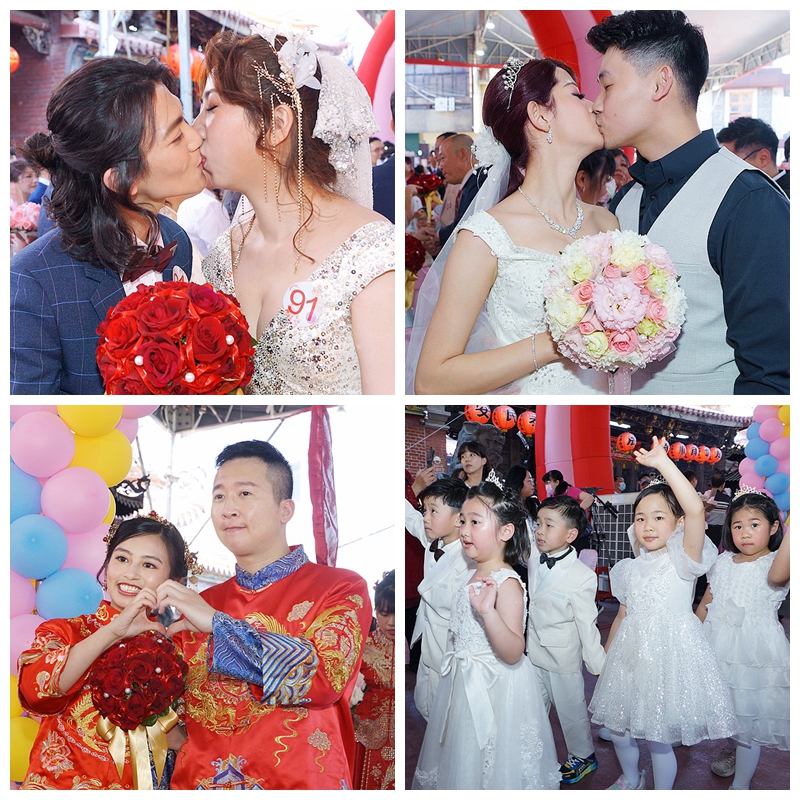 今年特加入進場不同氛圍,由清水區無極鎮安宮表演團隊(王素花)團長(小花喜婆)引領6對中西式男女小花童,迎花轎由三對穿中西式白紗、中式秀禾服⋯等,並由主持人為他們分享愛情故事隆重熱鬧進場。