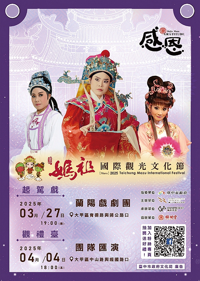 [新媒社 記者張銀澤/台中報導] 一年一度台中大甲鎮瀾宮媽祖遶境即將登場!台中市政府文化局舉辦「2025台中媽祖國際觀光文化節」,配合今(114)年大甲媽遶境日程,3月27日晚上7時在大甲區蔣公路及育德路口安排「起駕戲」,由「蘭陽戲劇團」演出《鐵面情》為遶境暖身;4月4日起駕當晚6時,邀請眾多優質演藝團隊帶來「觀禮台」匯演活動,歡迎民眾一同到大甲瘋媽祖,恭迎媽祖出巡!