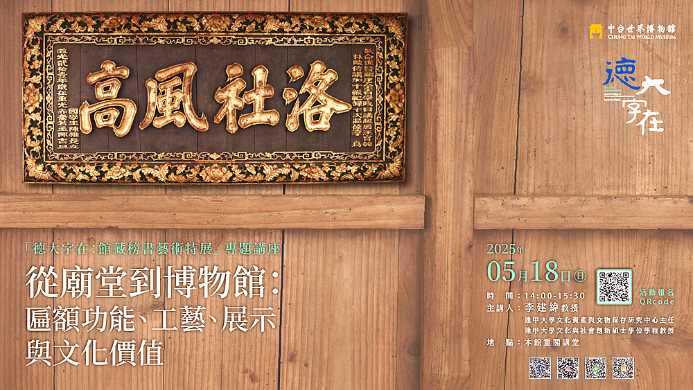 本館「德大字在:館藏榜書藝術特展」將於5月18日閉展。當日下午特邀逢甲大學李建緯教授,主講「從廟堂到博物館:匾額功能、工藝、展示與文化價值」,帶領觀眾探究匾額的藝術與歷史意涵。