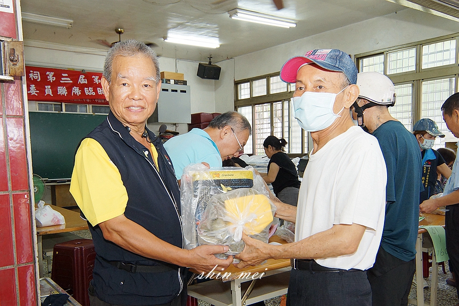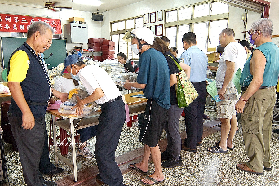 台中市東區東信里長 洪榮吉表示 東信里是個充滿愛心的社區,這次里辦公處和東信福德祠、長幼關懷協會、今日於東信福德祠舉辦綁粽送愛心,現場社區志工幫忙綁愛心粽,發送近3000顆肉粽給240多戶關懷戶,分送今天關懷戶來領端午粽的民眾,每戶1串10顆愛心肉粽,1包3公斤白米,讓民眾感受到社會的關懷,大家把愛心傳下去。