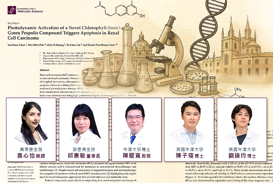 [新媒社 記者張銀澤/台中報導] 2025中英合作台灣生醫GPDT光動能榮登IJMS 癌症國際分子科學期刊 台灣歐思佛生技Dr.OXFORD (生技醫療股7519)與牛津大學暨英國奧帝康生醫Oxperial BioHealth 跨國團隊合作論文榮登國際期刊MDPI 的醫藥健康類Cancers(癌症) IJMS上發表、Int. J. Mol. Sci.(國際分子科學期刊),發現新型葉綠素化合物啟動消滅腎癌細胞光動能 GPDT 光動能(Green Products Photodynamic Technology)。