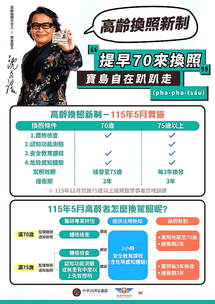 臺中區監理所南投監理站提醒,高齡換照的目的是協助長者到一定年齡做體檢及加強最新的交通安全知識,並透過模擬體驗實際道路情境,讓長者可安全駕(騎)車,各監理所、站會主動寄發通知書通知須換照的長輩,所以明(115)年5月起,滿70歲以上的長者,請於收到監理所、站通知再換照,不需提前要求換照。