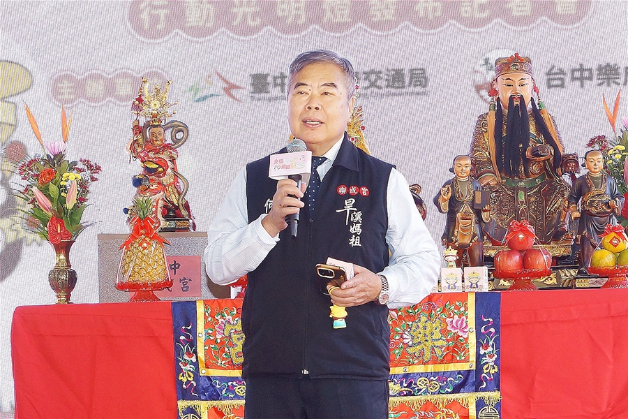 台中市政府交通局長葉昭甫今(29)日與樂成宮董事長何敏誠於樂成宮共同啟動「行動光明燈交通安全吊飾」亮燈儀式。當象徵庇佑的旱溪媽祖造型吊飾亮起時,現場民眾紛紛驚呼「好神氣」、「卡哇伊」,活動現場既溫馨又熱鬧。葉局長表示,此次以旱溪媽祖為發想打造上萬個可照明的行動光明燈,希望長輩能將吊飾別在衣物或包包上,提升夜間步行辨識度,落實台中市政府推動人本交通的用心與行動力。