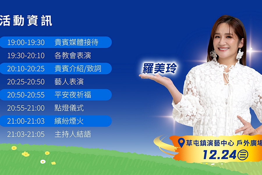 將於12月24日晚間7點,在草屯鎮演藝中心戶外廣場由「聖誕點燈晚會」揭開序幕,邀請基督徒歌手羅美玲溫暖獻唱,並點亮主題聖誕樹燈,當然還有最受期待的首場煙火秀。