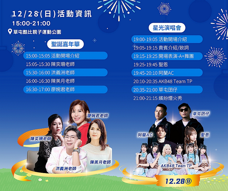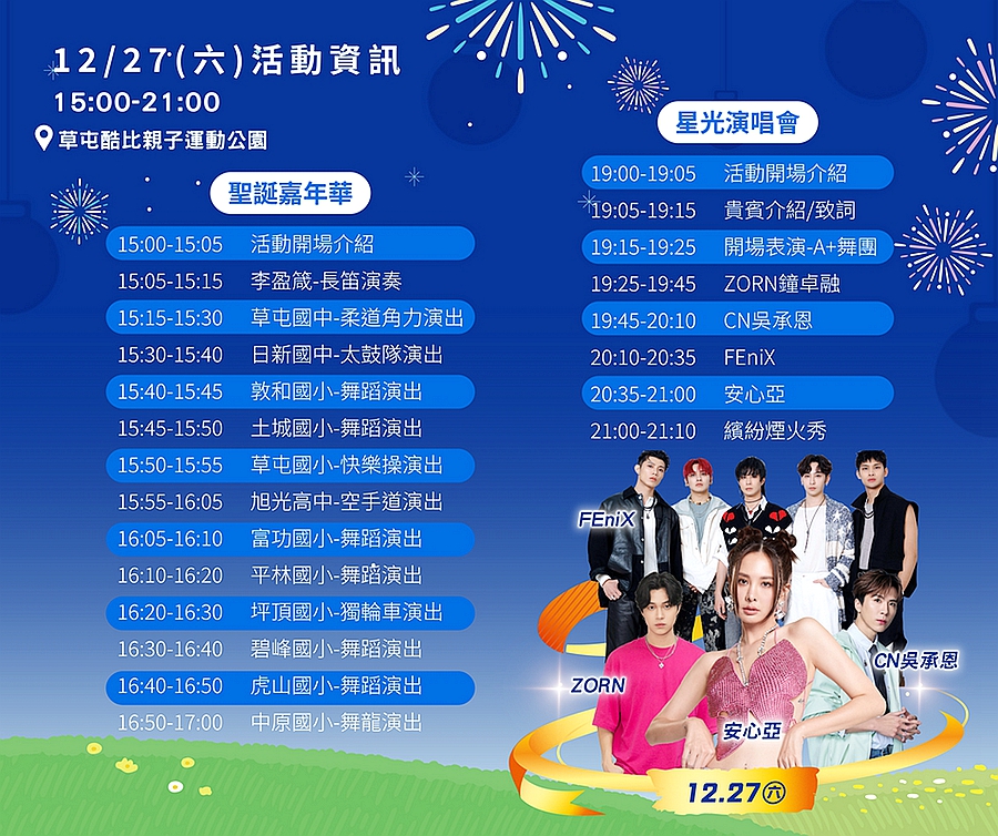 [新媒社 記者張銀澤/南投報導] 為迎接年末旅遊旺季,南投縣政府與草屯鎮公所首度攜手合作,整合在地教會與觀光資源,推出歷年規模最大的「草屯聖誕煙火嘉年華」。活動將於12月24日、27日及28日登場,不僅有連續三晚的璀璨煙火秀,更邀請安心亞、在地天團草屯囝仔等豪華卡司接力演出,打造草屯最熱鬧的冬季盛宴。