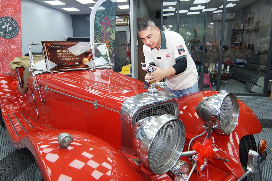 主辦單位特別說明,這輛古董跑車在執行美容前,漆面因年代久遠而顯得晦暗且佈滿細微紋路。現場由 IDA 認證技師團隊依照國際標準流程執行。首先,透過科學儀器檢測漆面厚度,確保在「不傷原漆」的非破壞性前提下進行修復。接著,利用 IDA 規範的藥劑與低溫拋光技術,逐一排除氧化層與刮痕。