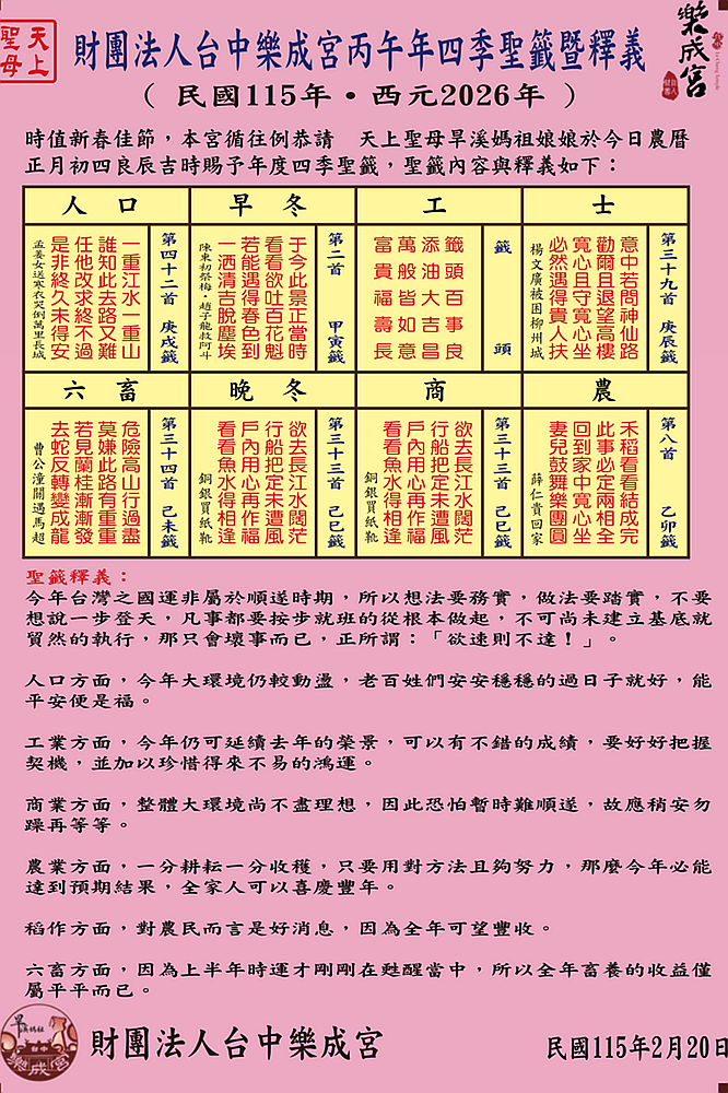 115年台中 樂成宮-丙午年 四季聖籤 !