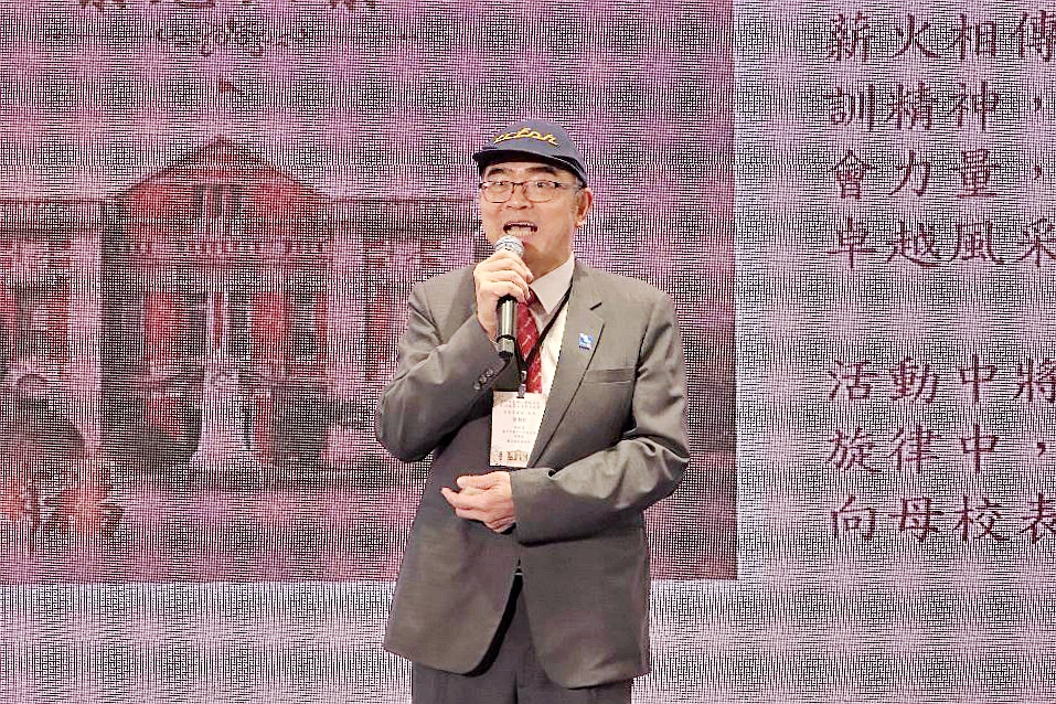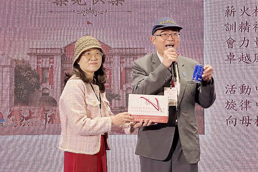 張朝帆理事長更親自登台高歌〈站在高崗上〉,豪邁而開朗的歌聲瞬間點亮全場。隨後,他邀請林隆諺校長、歷屆理事長與友會理事長、現任幹部一同上台,在輕快旋律中帶領全場校友齊聲歡唱〈您是我的花朵〉,歌聲與笑聲交織,會場洋溢著溫暖與喜悅。