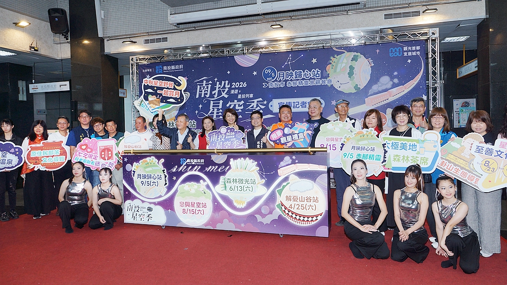 [新媒社 記者張銀澤/南投報導] 2026「南投星空季」系列活動即將開跑,縣府14日上午在1樓大廳舉辦活動宣傳記者會,這次以「星投列車」為概念,將分別在4月25日東埔、6月13日溪頭、8月15日清境、9月5日南投市赤腳精靈景觀餐廳等4個地區推出四場主題日活動,縣長許淑華廣邀全國民眾參加。