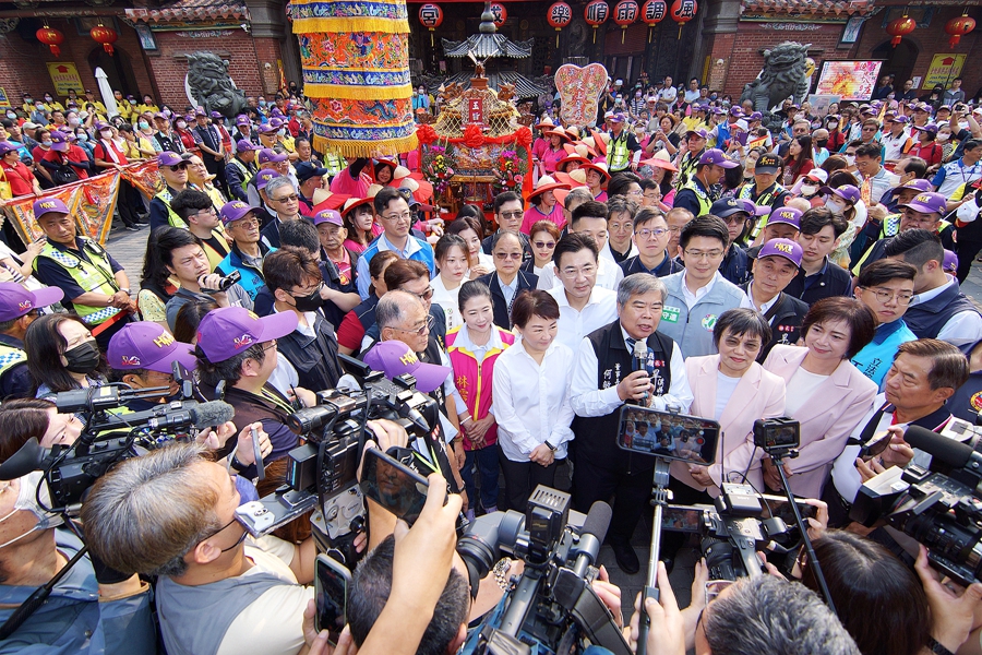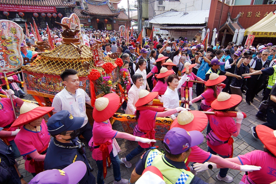 今日一早許多信眾到場參與遶境盛會,盧市長與樂成宮董事長何敏誠率領現場眾來賓行禮祝禱,遶境十八庄隊伍頭燈、宮大旗、小宮燈隊、繡旗隊、三十六執事等隊伍整齊排列於廟埕兩側,起駕吉時到,在莊嚴低沉的哨角聲中,盧市長恭請旱溪媽祖上鑾轎,並親自扶鑾轎與女子神轎班踩著大小禮步,向著樂成宮內眾仙佛行拜禮辭行後,旱溪媽祖鑾轎正式起駕出巡。