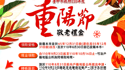 110年台中九九重陽節 -敬老禮金9/23起發放 !